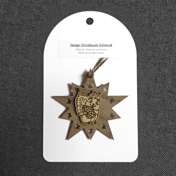 Design Christbaum-Schmuck Doppelstern Walnuss/Ahorn, Motiv Eichhörnchen