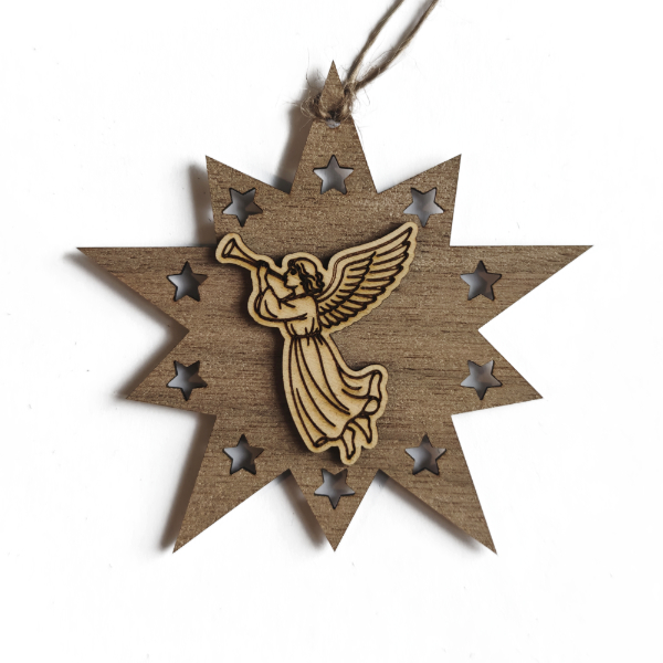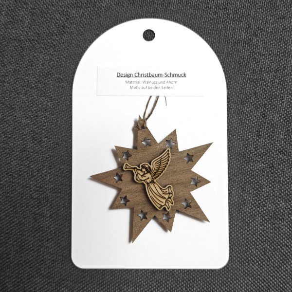 Design Christbaum-Schmuck Doppelstern Walnuss/Ahorn, Motiv Engel links (Erwachsener)